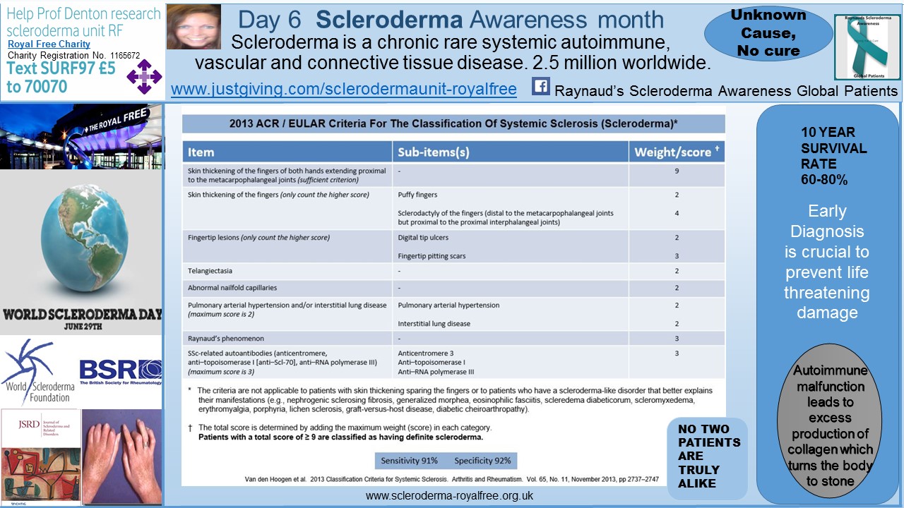 DAY 6 Scleroderma Awareness Month Over the decades, more has gradually become known and understood about scleroderma and the symptoms which it presents. Today’s post is a copy of the current guidelines which are accepted globally, when reaching a systemic sclerosis, scleroderma diagnosis. Due to the multi complex…